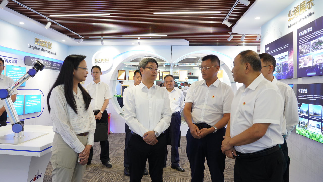 陳錫明一行走進航天建設所屬航天設計企業展廳,詳細了解企業歷史沿革、關鍵核心技術及資質、市場拓展、產業發展、黨建工作等基本情況。
