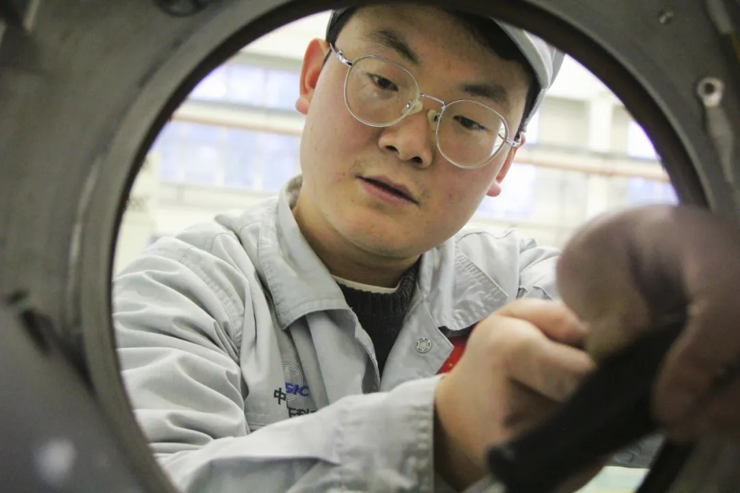 裝配車間內,負責首件產品艙段裝配工作的操作員楊振宇,正手持塞尺,對一部件的安裝間隙進行裝后自檢。