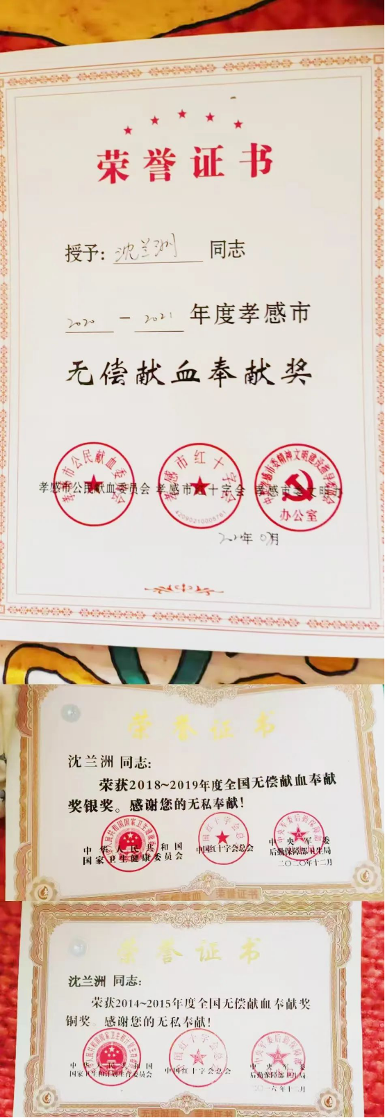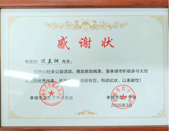 沈蘭洲獲“孝感市無償獻血優(yōu)秀個人(全血)”榮譽稱號