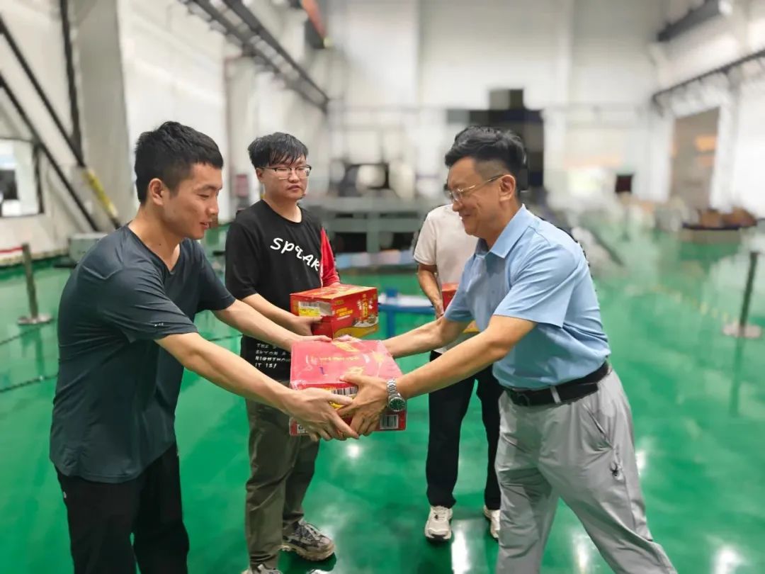 7月8日,航天三江黨委書記、董事長高輝文,黨委委員、總會計師弓興隆前往快舟產業園慰問高溫下奮戰一線的快舟試驗隊員和各項目人員。