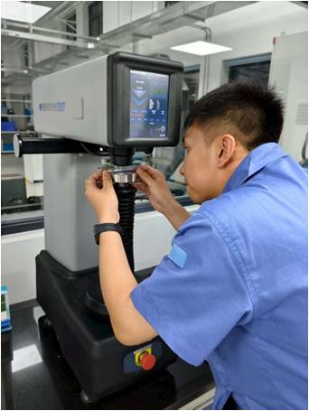 位于701庫的性能組實(shí)驗(yàn)室里燈火通明,試驗(yàn)機(jī)與洛氏硬度計(jì)發(fā)出持續(xù)不斷的規(guī)律蜂鳴。性能組組長黃姐和組員小王被堆積如山的待檢樣品包圍。每一份樣品都需經(jīng)受嚴(yán)格考驗(yàn):電子萬能試驗(yàn)機(jī)上,金屬樣條被緩緩拉長直至斷裂,電腦屏幕實(shí)時(shí)繪制著反應(yīng)材料強(qiáng)度的拉伸曲線;洛氏硬度計(jì)旁,檢測(cè)員凝神屏息,在無數(shù)樣品表面精準(zhǔn)施壓,記錄著一個(gè)個(gè)硬度數(shù)據(jù)點(diǎn)。連續(xù)數(shù)小時(shí)高強(qiáng)度操作,手臂早已酸痛難當(dāng),目光卻依舊如炬,牢牢鎖定每一個(gè)讀數(shù)、每一個(gè)數(shù)據(jù)點(diǎn)。